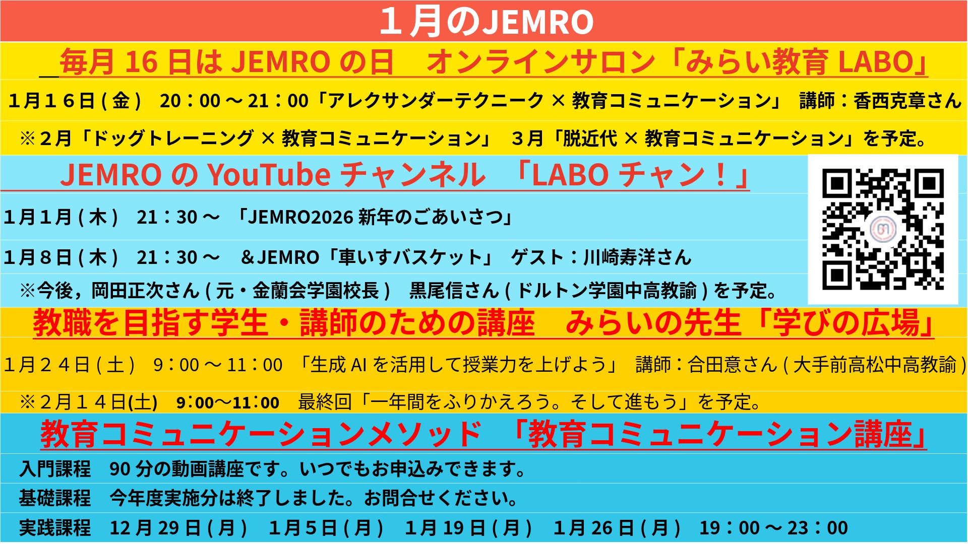 2026年 01月 04日お知らせ 1月のJEMRO活動予定表です。こちらから日程をご確認ください。 ご興味があるものがありましたら,お声がけください。JEMROは,一緒に活動していただけるお仲間を募集しています。
